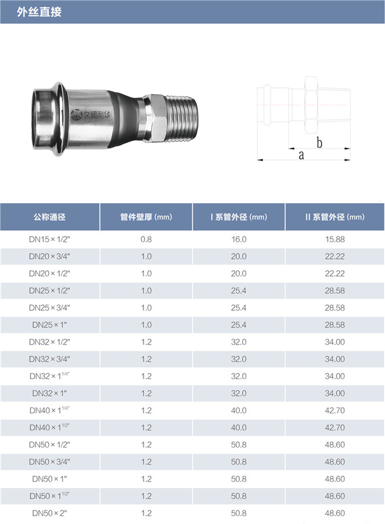 外絲直接丨材質(zhì)(Grade): 304/304L、316L 丨原料來源(Source of raw materials): 全部符合相關(guān)國家標(biāo)準(zhǔn)要求,用料來源酒鋼、太鋼、張浦、東特等 丨焊接方式(Welding method): 氬弧焊或等離子焊(TIG OR PLASMA在線)+氬弧焊(TIG離線) 丨執(zhí)行標(biāo)準(zhǔn)(Executive standard): GB/T 19228.2-2011 GB/T12771 丨參數(shù)對照表(Parameters):