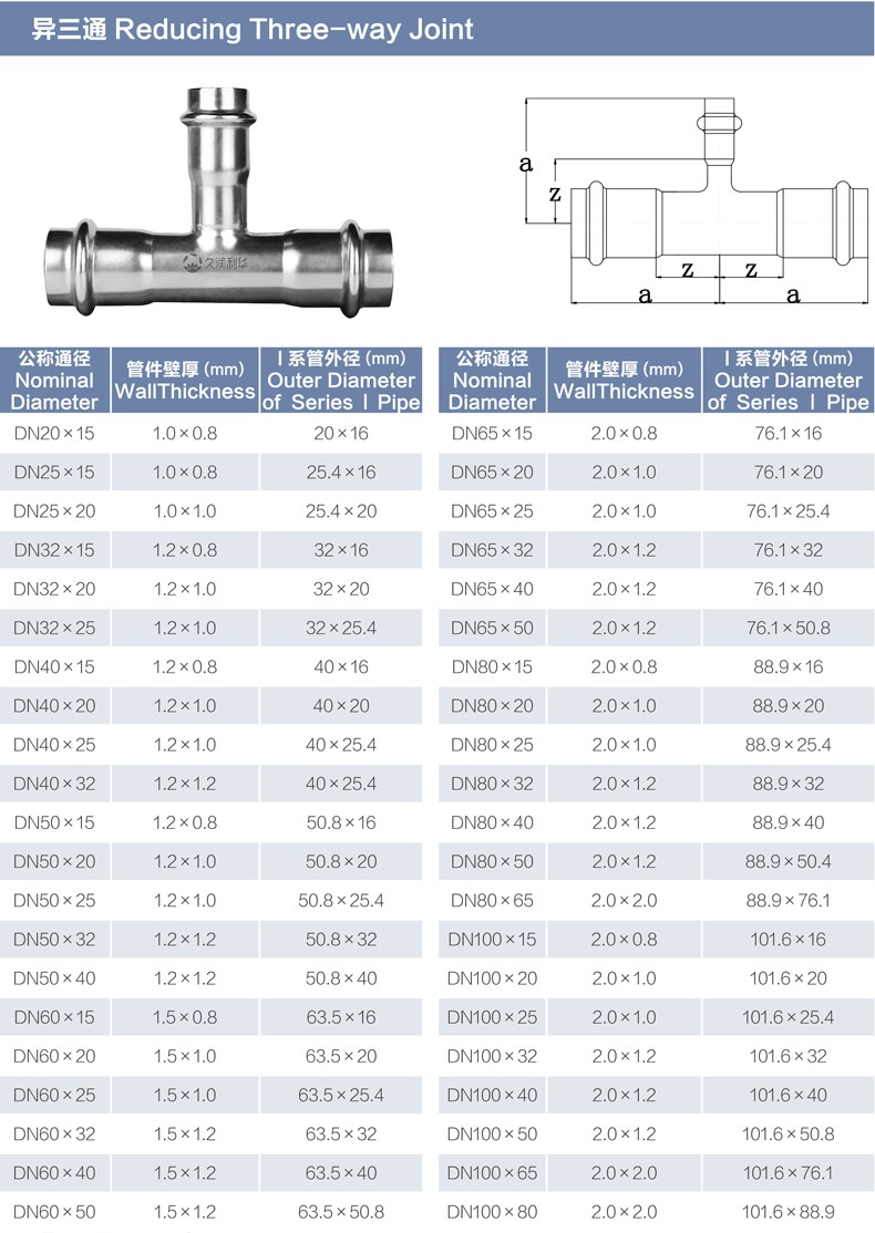 丨質量體系(Quality system): 公司擁有ISO9001質量管理體系認證和壓力管道元件制造許可證,具有健全的質量檢測控制體系,配備設立了工業(yè)CT、化學分析、渦流檢測、水壓試驗、氣密性試驗、萬能試驗機等檢驗環(huán)節(jié)或檢測設備,并建立了以顧客滿意為目標的售后服務體系,保證產品質量,滿足顧客需求 場景應用 (Application): 醫(yī)院、地鐵站、學校、會議中心、機場、家庭用水、小區(qū)二次供水、終端家裝等 丨關于運輸(Transport): 普通運輸,打捆不包裝運輸;特殊運輸 打捆外包(包、箱、防護集裝箱)運輸。 如有其它特殊要求請咨詢在線客服或致電:13573388823。 丨連接方式及安裝步驟(Connection method): 雙卡壓式、溝槽式、承插焊接式 丨產品圖片(Product Pictures):